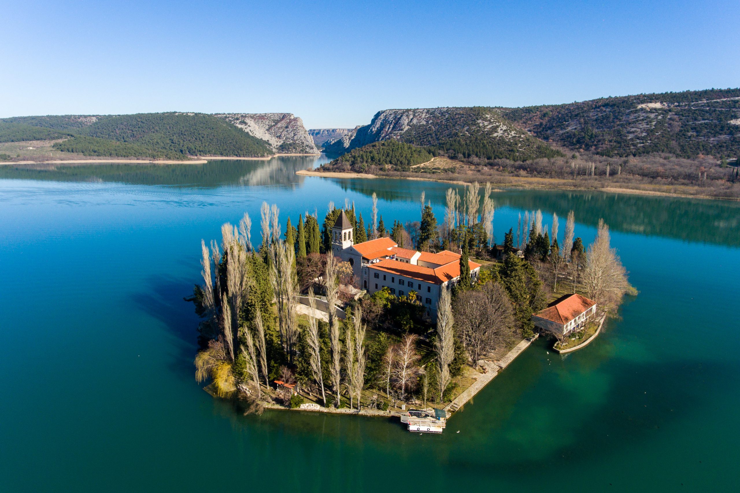 Medzi početnými vodopádmi zvláštnej krásy vyniká Skradinski buk a Roškiho facka, medzi ktorými na brehu jazera leží ostrovček Visovac s františkánskym kláštorom.www.npkrka.hr